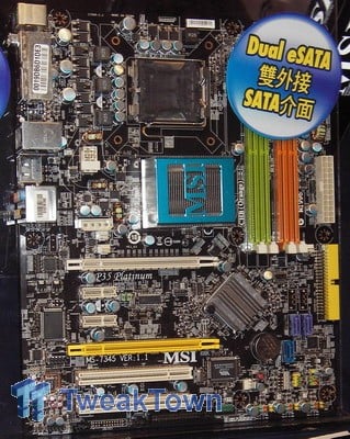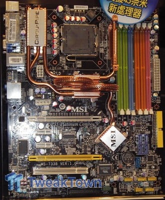 Next up is the P35 Platinum, which is exactly the same as the G33 Platinum, but without the integrated graphics. MSI also did a Combo board in the Platinum series, the P35 Platinum Combo, which has a total of six memory slots, four for DDR2 and two for DDR3. Again it shares the same features as the G33 Platinum and if you look really closely you will notice that this early board has a D-Sub connector, although it is unlikely that this will be on the final boards, as they will not have integrated graphics.