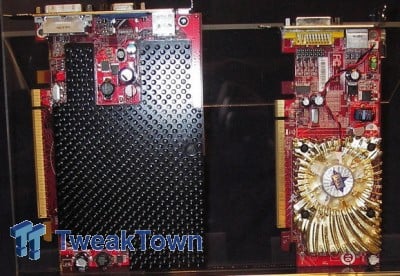 Now, for those of you that have been waiting for the graphics cards, you are in for a treat, as MSI showed its entire range of Radeon HD 2x00 cards. First up is a pair of Radeon HD 2400 Pro cards, one full size, passively cooled, 256MB card and one half-height, actively cooled, 128MB card. Both cards use DDR2 memory, but sadly no clock speeds were given for either card. Both cards had a DVI connector and TV-out, while the half height card only offered a D-Sub as a wired option.