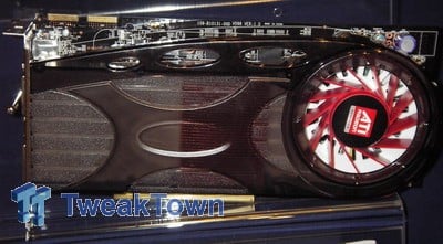 Next we have the MSI RX2600XT-T2D256E, which as it happens, is a Radeon HD 2600XT with dual-DVI, TV-out and 256MB of GDDR4 memory. Again a total lack of clock speeds, but the interesting thing here is that it is an MSI design and it is using a black PCB. The cooler actually looks quite similar to that of the Radeon X1950XTX, but without the heat pipe. The card features internal Crossfire connectors and there was space on the back of the card for additional memory for a 512MB version. Interestingly, this card did not feature the extra power connector that we expected it to have, although there is space for a power connector at the top of the PCB.