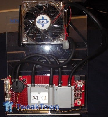 Finally we have the card that you have all been waiting for, the RX2900XT OC Liquid. OK, yes we know, the name is not exactly going to make you go "ooh, aaah" but hey, it is the first water cooled Radeon HD 2900XT to be shown by anyone, so do not knock it! MSI has made a rather interesting design here. For starters, the small pump is powered directly from the card, as it is connected to one of the two fan headers. Then there are the two waterblocks attached to the massive heatsink that is covering almost the entire card. Presumably the first of the two waterblocks is cooling the GPU, while the second smaller waterblock is cooling the digital MOSFETs for the power regulation. It is a shame that the two waterblocks are connected with such a long piece of tubing, as this is not a pretty solution. The radiator is cooled by a 120mm fan, however, we are curious where you are going to fit this, unless you have got a massive case in which you can fit the radiator on the side panel.