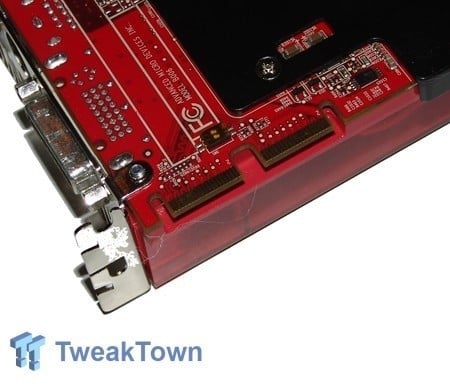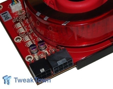 The top of the card has two power connectors - the 6-pin connector along with the 8-pin connector. Unfortunately unless your power supply has an 8-pin connector, you will lose the ability to have Overdrive enabled, which is the automatic overclocking program, built into Catalyst Control Center.