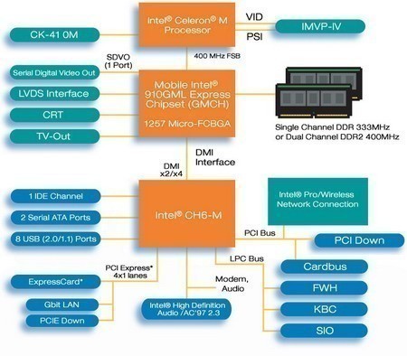 The physical chipset is based on the 910 GML Express chipset series and below we have a schematic courtesy of Intel. This schematic is a representation of possible layouts vendors can initiate.