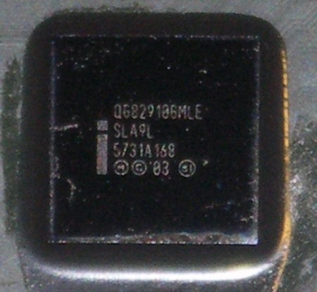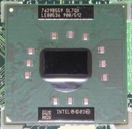 The Intel Celeron M CPU runs at 900MHz with 9x clock multiplier. The L1 cache is 64KB, the L2 cache size is 512KB and the Bus speed is rated at 400MHz (100x4). The processor is manufactured with the 90nm technology and works from a 479-ball lead free Micro-FCBGA. This particular model is from the B1 stepping, with a CPUID of 06D6h. The CPU draws 0.94Volts and supports multimedia instruction sets-MMX, SSE, SSE2. The TDP of the chip is a very low 5.5W. This low heat signature makes it ideal for a platform of this type.