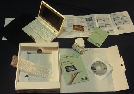 Here we have the full kit, manuals and all. This picture is for your reference as we strip the Eee PC down and lay her secrets out.
