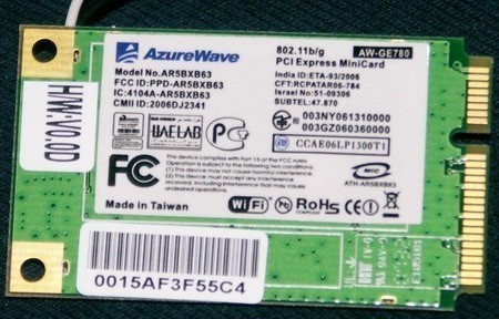 The Wireless communications card is an Azure 802.11b/g Wi-Fi PCI-E card with speculation about possible Bluetooth integration at launch.