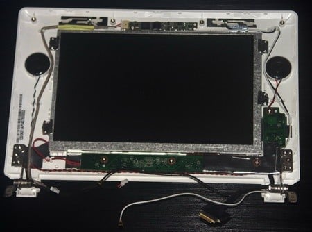 With the top layer off I was ready to put down my tools and get the camera snap shots. Check out these gorgeous pictures. The Eee PC is opened up and if you zoom in you can see the backside of the motherboard. The central white crevasse in the middle is the slot where the DDR2 RAM fits in.