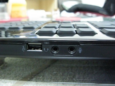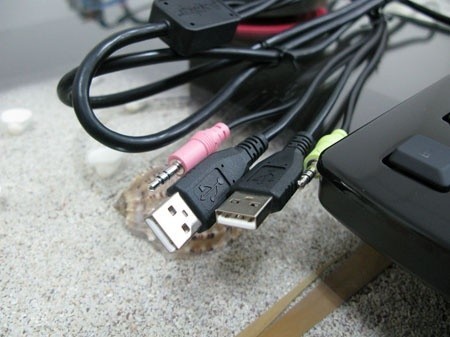 Talking connectors, we have a thick trunk of cable attached to this board with two USB connectors; one for the keyboard and one for the USB port, as well as line-out and microphone pass through so that you can jack your headphones right into the back of the board.