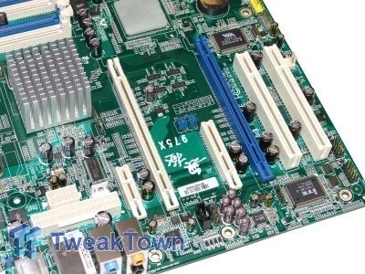 Lastly here we have the expansion slots and the extra features not native to the chipset. There are a couple PCI Express x16 slots for Crossfire, 2 PCI Express x1 and 2 PCI slot. Extra features include an extra IDE slot thanks to the JMicron PCI Express RAID controller. This controller also runs an extra blue SATA port at the bottom of the board. VIA's Firewire chip also makes a return to this board and Intel's Tacoma network controller also make its appearance.