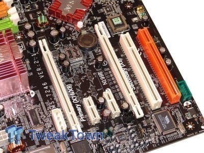 Expansion slots are extremely important. Two PCI Express x16 slots are provided for ATI Crossfire compatibility. When two Crossfire cards are inserted, the PCI Express x16 slots transform into x8 slots. A single PCI Express x1 slots resided above the primary PCI Express x16 slot and a PCI Express x4 slot sits between the PCI Express x16 slots. Two PCI legacy slots are included to give your older PCI cards some room.