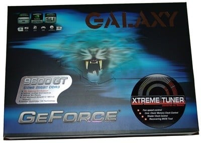 Looking around the box it's a pretty standard affair; the top shows a multitude of logos along with the Galaxy logo to the right. The bottom mentions GeForce and the right shows a sticker that mentions Xtreme Tuner which is some overclocking software provided by Galaxy.