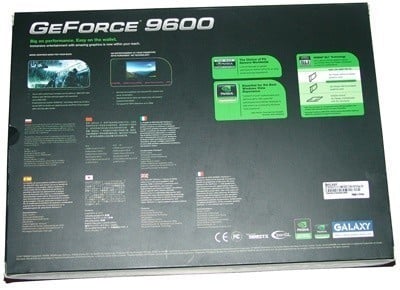 Across the bottom we also have another sticker that mentions the model of the card, which in this case is the 9600GT. Some of the main specifications on the card are also mentioned here such as 512MB of GDDR3, 256-BIT, PCI Express 2.0 support, DX 10, SLI ready and more.
