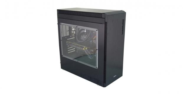 Powering our system inside of the PC-J60 B, we heard very little from the 120mm and 140mm fans, only 32 dB if we were within a foot of the side or back. The fact that the side panel window is clear and not tinted also means you do not need to spend extra money on case lighting, as we can see everything in plain sight, even the LEDs on the card, AIO, and the motherboard.