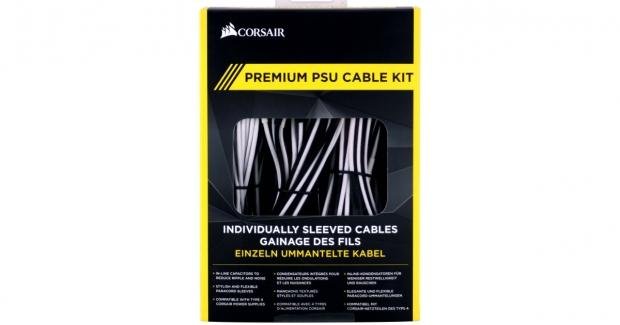 Using black with bright yellow trim, Corsair ships the Premium PSU Cable Kit in a box with a window to view the color of wires inside of the box. In this instance, we got the white and black set of individually sleeved cables, which offer in-line capacitors, they are stylish and flexible with paracord sleeves and are compatible with Type 4 Corsair power supplies.