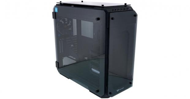 The front of the chassis is one large expanse of tempered glass, which is slightly tinted, and held onto the front bezel with four black thumbscrews. The top-right corner is angled to allow easier access to the power button, and at the bottom is the only mention of the Thermaltake name and logo on the exterior of the chassis.