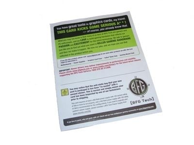 Opening up the box the first thing you see is an A4 piece of paper that lets you know that you are buying a BFG graphics card, information about getting the latest drivers along with the power supply requirements.
