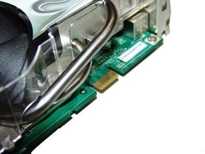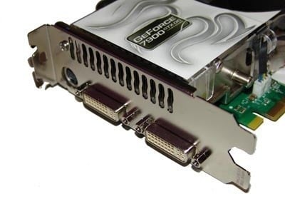 Having a peak at the side of the card we can see our two DVI ports and S-Video like port. While the DVI ports don't look any different to your normal ones, as we mentioned they are both Dual Link DVI-I ports to compete against the high-end ATI offering which gives two Dual Link DVI-I ports.