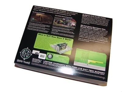 Turning the box over we have got our extended features of the board along with how SLI works. The two main features you can see which are being pushed is Mind-Blowing Performance and Ultra-Realistic Effects & Visual Quality.