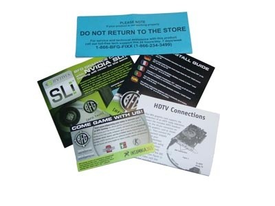 Paper wise we have a few pieces included that let you know how you use the HDTV connections available, a small piece about BFG Gaming, SLI run down, Install Guide and a note about technical support, with this said though the Australian distributor has let us know that this isn't valid in Australia.