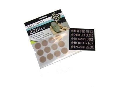 With the piece of paper aside we have a few cool extras. First out of the box we have some Teflon Stick Pads which are used on the bottom of your mouse and gives you extra smoothness you didn't think you could get. We also have some stickers that you can install on the card or anywhere else which have some witty sayings.