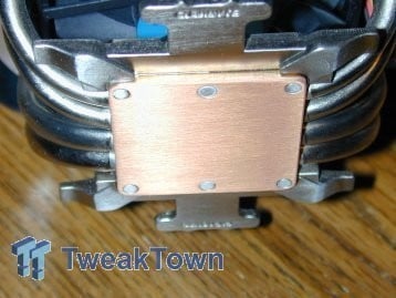 You can also see the four heatpipes running through the fin system. For those who are new to building or are not up to speed on this technology, it is a system of hollow tubes that contain a wicking material and a liquid transfer substance. When heat is transferred to the copper base, it is carried into the heatpipes where it rises and is dissipated. While a relative newcomer in the computer cooling sector, the technology has been in use with industrial equipment since the 1960's.